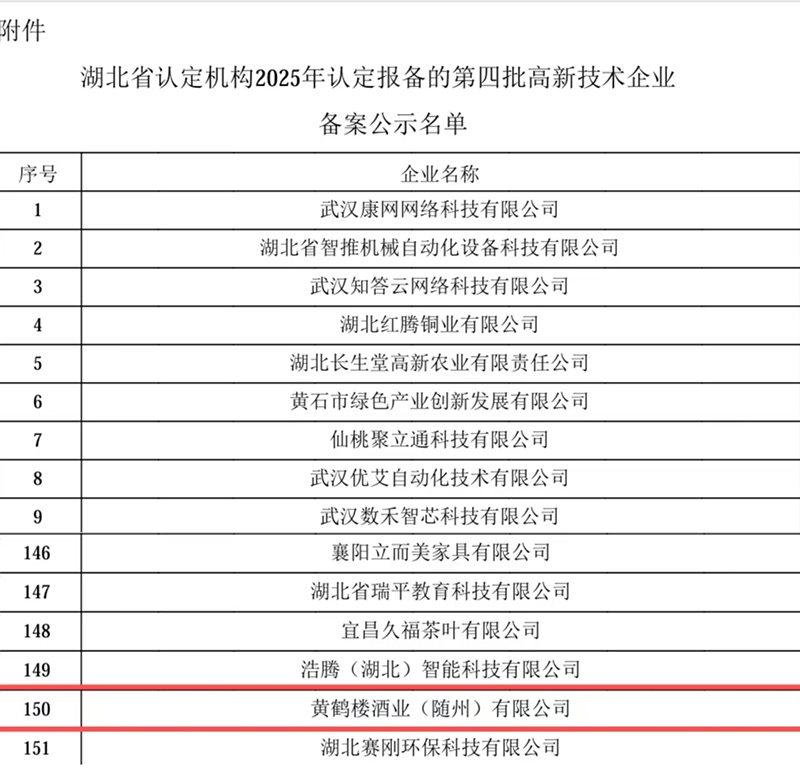 近日,湖北省认定机构发布《关于对2025年认定报备的第四批高新技术企业进行备案的公示》,U乐国际酒业(随州)有限公司成功入选第四批高新技术企业备案公示名单。